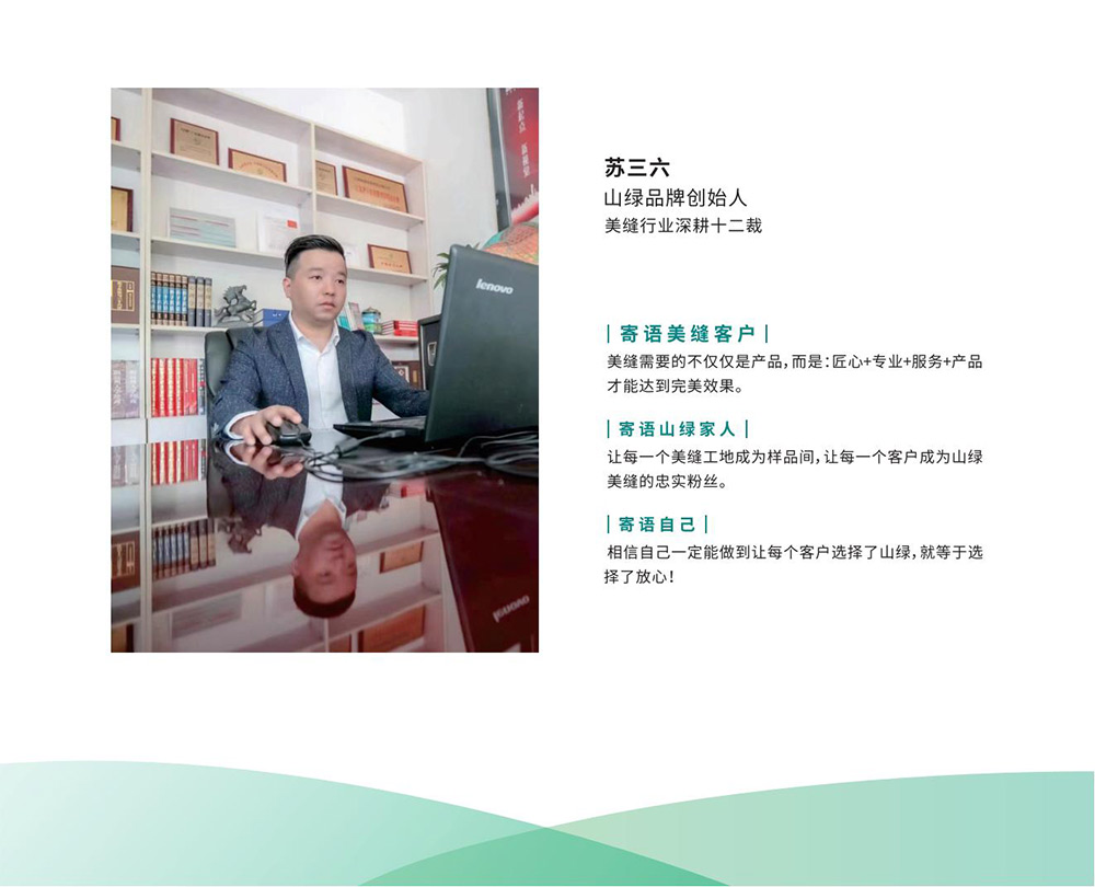 公司简介 资质荣誉 山绿优势 经销商与客户风采展示山绿坚持的纯手工美缝逐渐发展为美缝行业里的一个特色标杆。而以纯手工美缝施工工艺为基础,探索出来的一砖一色特色美缝技术,成为美缝施工工艺上一个里程碑式的创新,是真正钻研于美缝,立志塑造缝隙艺术美的山绿人的一个突破,它打破了固有思维,提升了审美能力,将小小缝隙展示出无限美的可能。