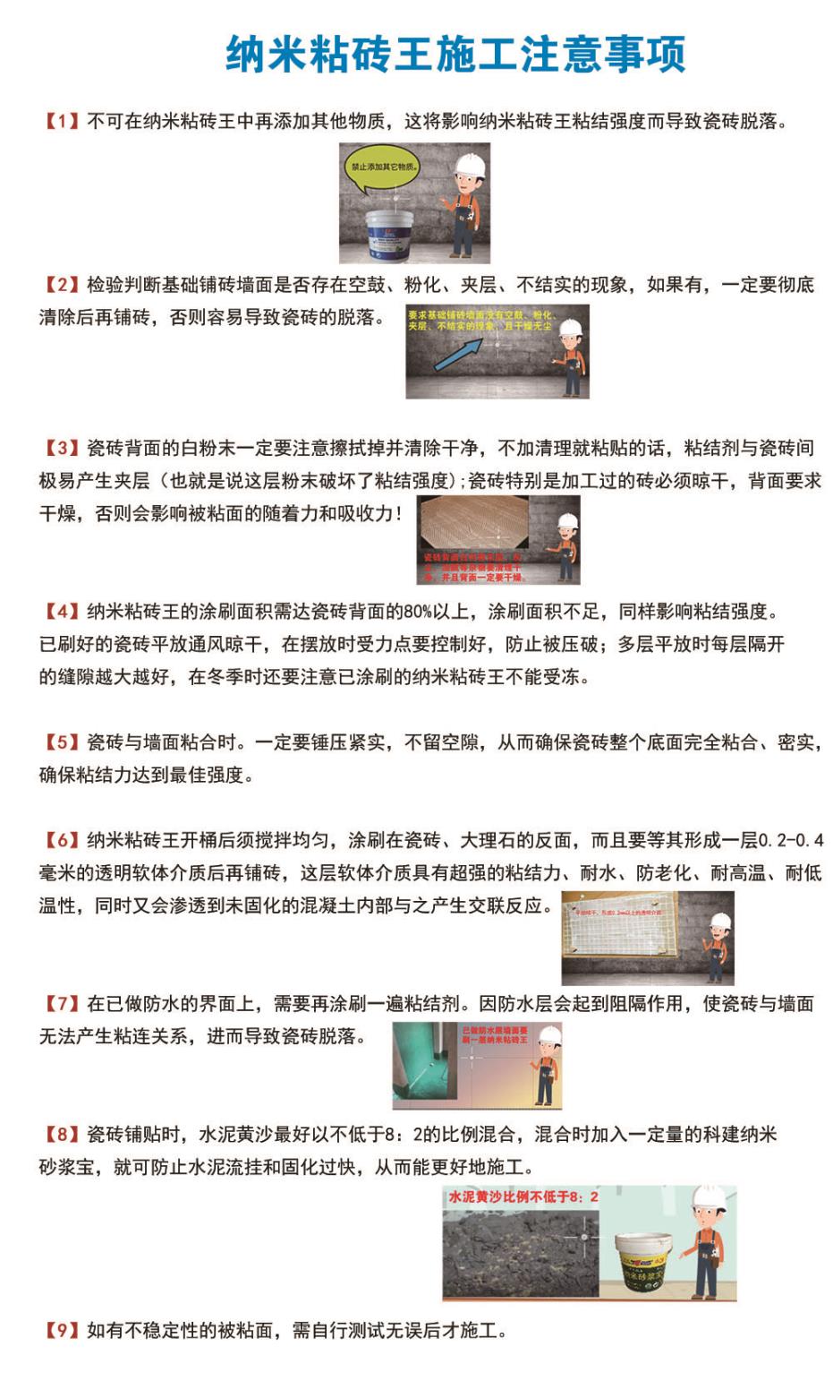 2)施工:将粘砖王搅拌均匀后,直接涂刷在瓷砖、马赛克、大理石、人造石材的背面(砖四周可留2mm左右,以防流到正面),等其表面呈透明状,用普通水泥砂浆铺贴,即可。被贴的墙面也建议涂刷一遍TOP BEST纳米粘砖王,这样粘结力更强,防水效果更好,绝对不空鼓、不脱落。