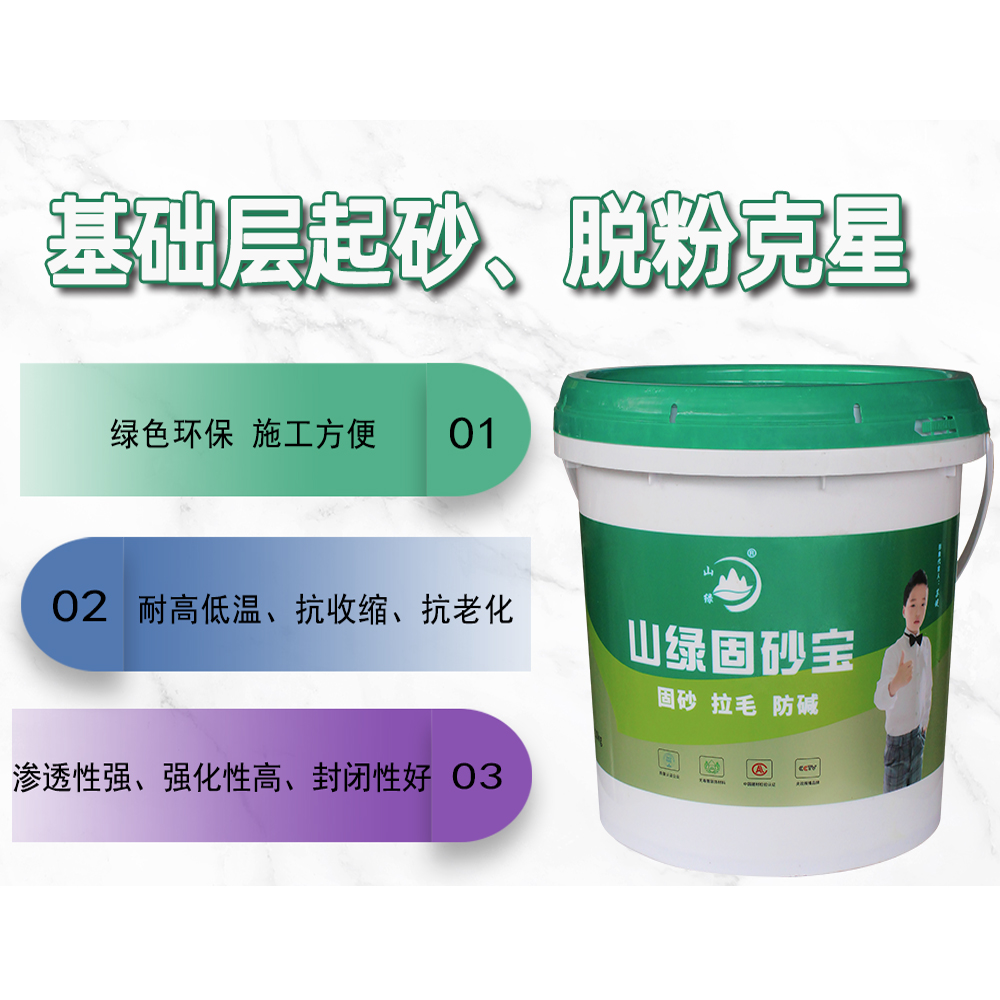 山绿固砂宝为环保型单组份白色水性乳液状涂料,主要采用高档聚合物乳液及助剂为主要原料,二次反应形成封闭性、固化性强的强化胶。本产品渗透性强,涂刷于强度低的基层面上可达到渗透的效果,彻底强化基层,提高基层硬度。同时具有高弹性和延展性,可按固砂宝:砂:水泥=1:1.5:2比例混合均匀后,给墙面做拉毛处理,有效增加墙砖与墙面的粘结力。