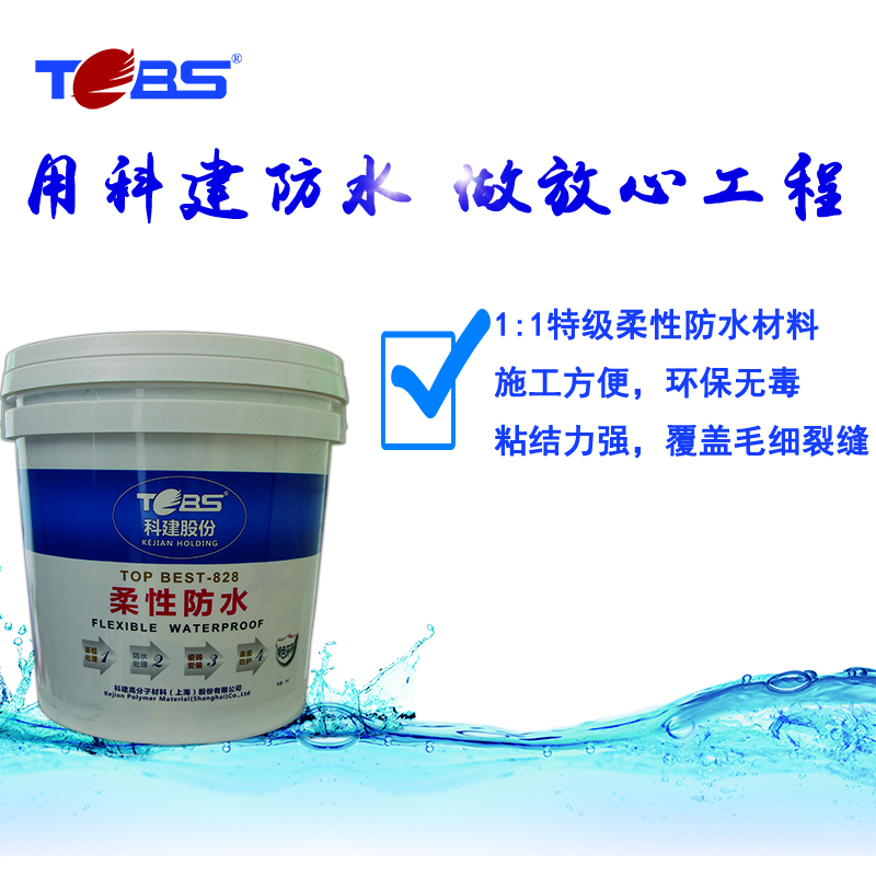 科建TOP BEST-828防水涂料是由双组份高分子聚合物改性组成的一种柔性防水材料,使用一种粉料与液体添加剂相混合,涂上固化后,得到一种柔韧性的防水膜并与原先的混凝土及新的水泥砂浆都有良好的粘附力,能与之形成紧密牢固的结合体,还能抵抗一定范围的裂缝。